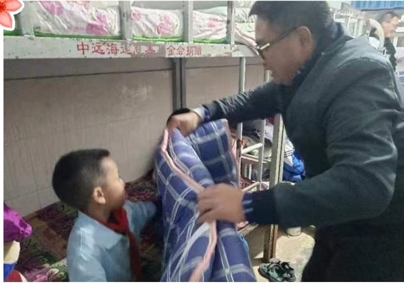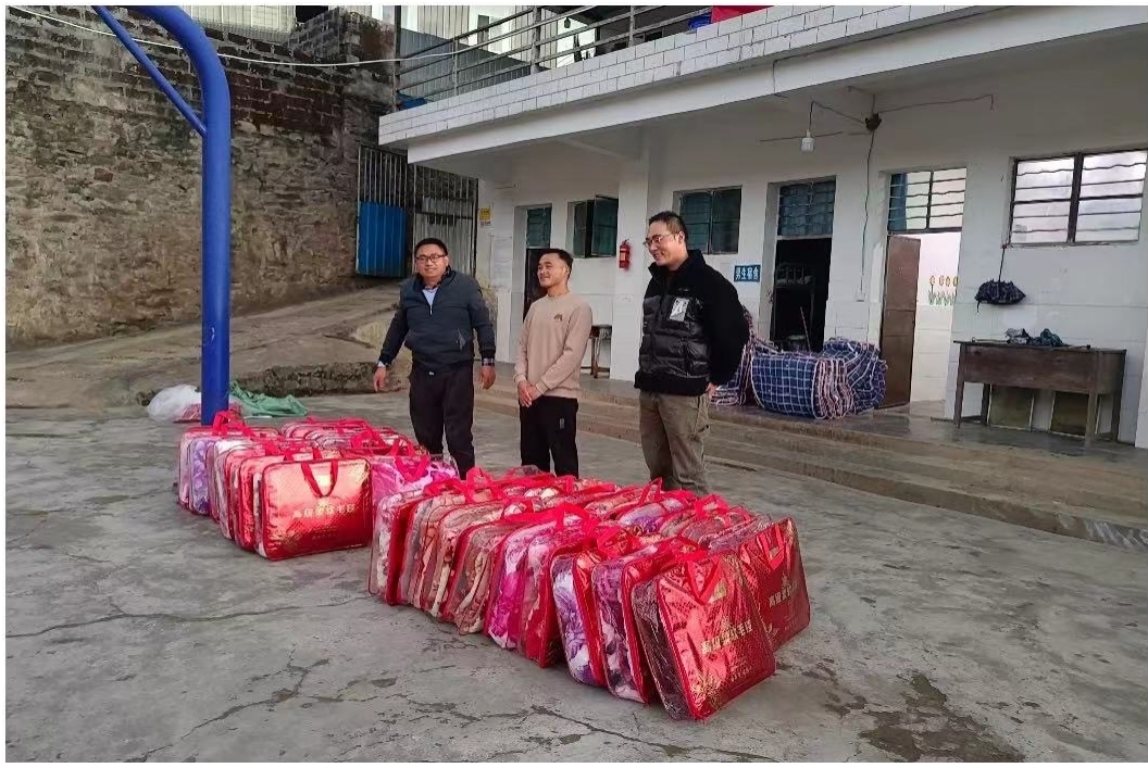 向龚家寨小学学生分发毛毯