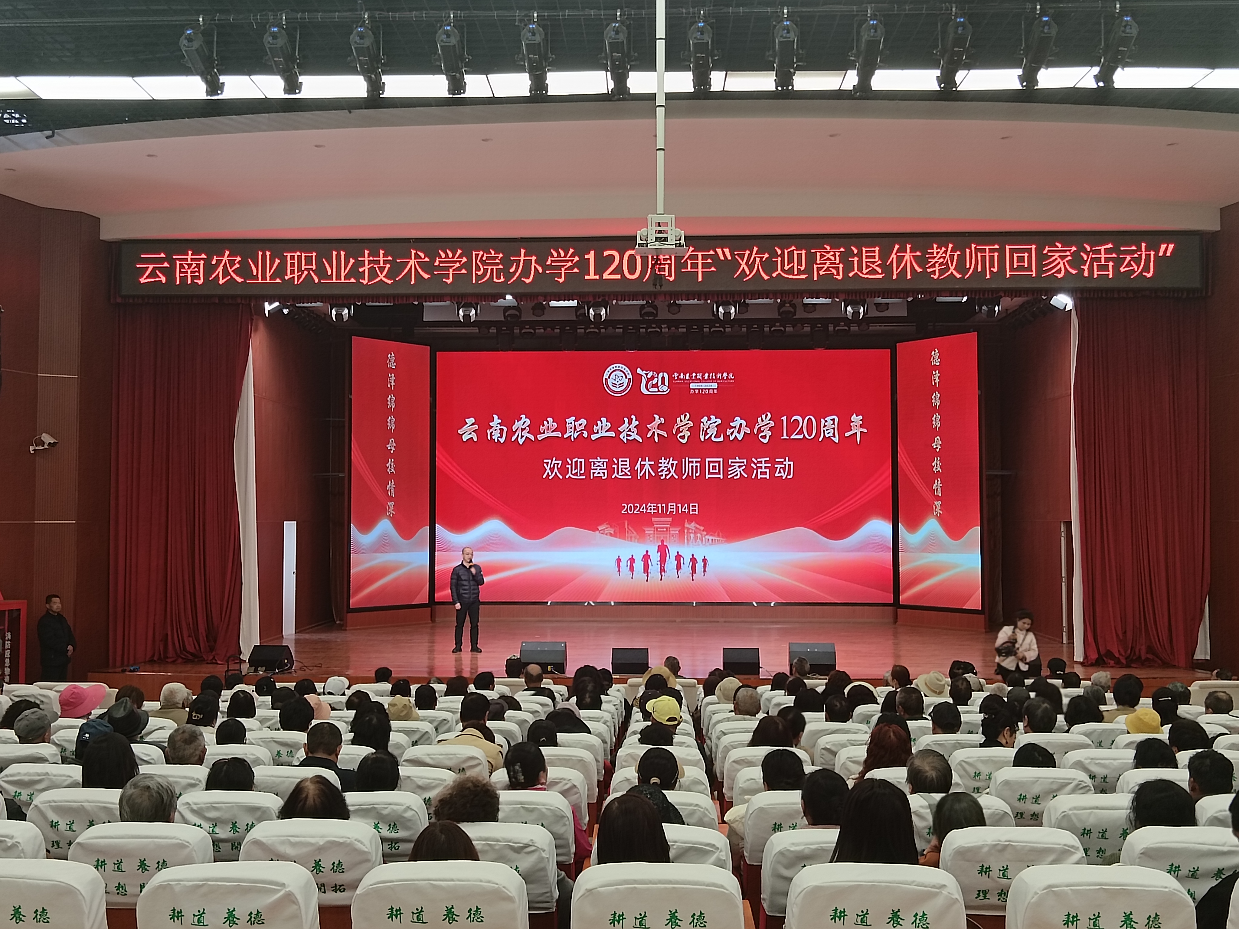 办学120周年“回家”活动,共同重温往昔岁月。11月14日,在小哨校区举办了学校办学120周年“回家”活动,上午10:00,在蚕桑礼堂召开离退休老同志大会,在会上学校党委副书记杨波同志代表学校党委向离退休教职工致以诚挚的问候和节日的祝福,对大家长期以来为学校发展倾注的心血与作出的贡献表示崇高敬意和衷心感谢。并向大家介绍了学校近年来取得的喜人成绩和学校办学120周年大会庆祝活动筹备情况,希望老同志们继续发挥优势特长,关注支持学校各项工作,为学校的“双高”申报和发展建设作出积极的贡献。参会400余名老同志共同观看了学校办学120周年宣传片,大会在校歌《红土地上谱新章》中结束,会后离退休老同志自行参观校园,共同重温往昔岁月,感受学校的新变化。下午的活动在小哨“花庄牧歌”农庄开展,形式丰富多彩。相约金秋乐享棋牌、欢庆重阳主题茶话会、花灯歌舞、游园小游戏、健康义诊、“劳动创造美”之最美劳动者实践等活动,让老同志们欢聚一堂,身心愉悦。学校党委委员、副校长苏华伟,原党委委员、副校长雷衡来到活动现场走访慰问,关切地询问老同志们的身体状况和生活情况,嘱咐老同志们要保重身体,保持乐观心态。