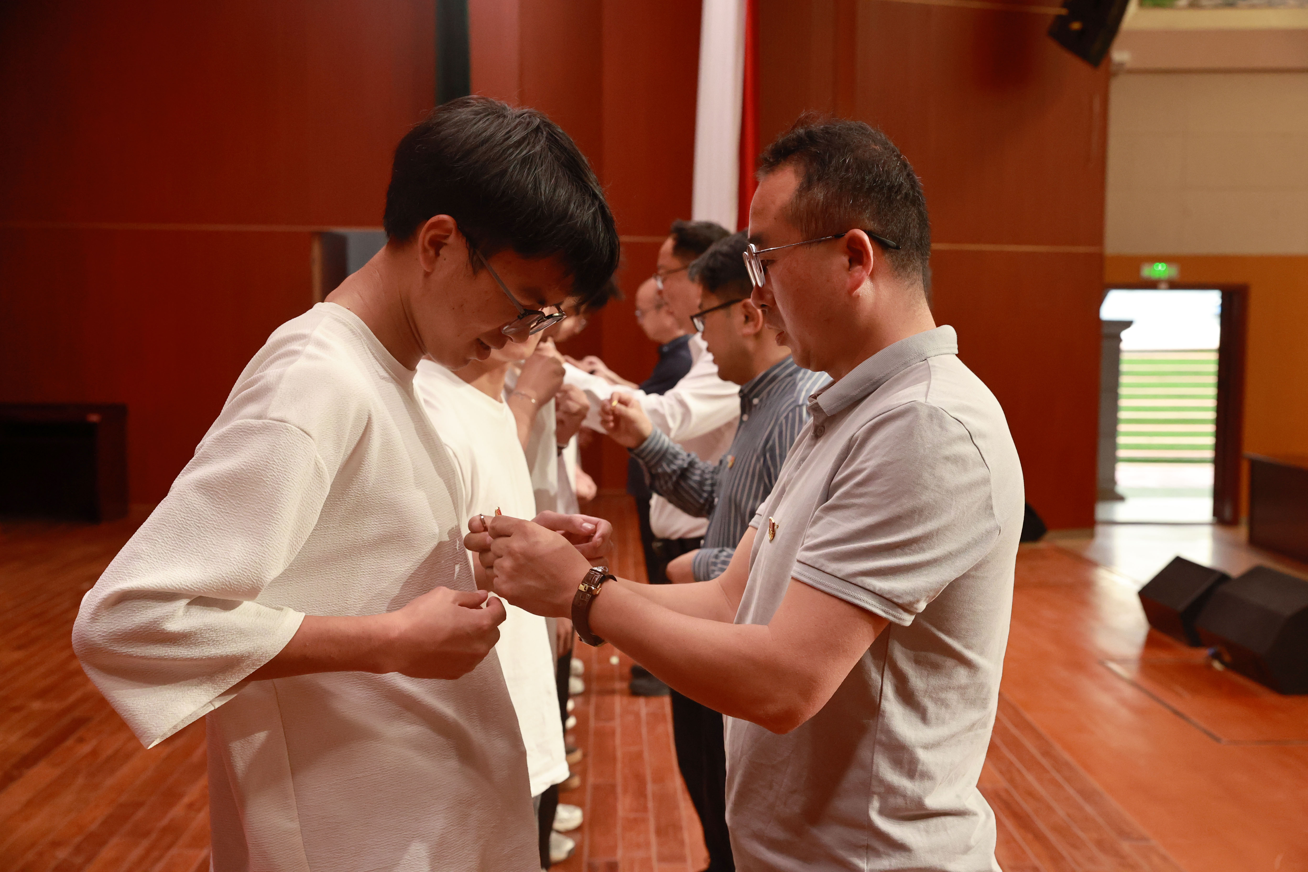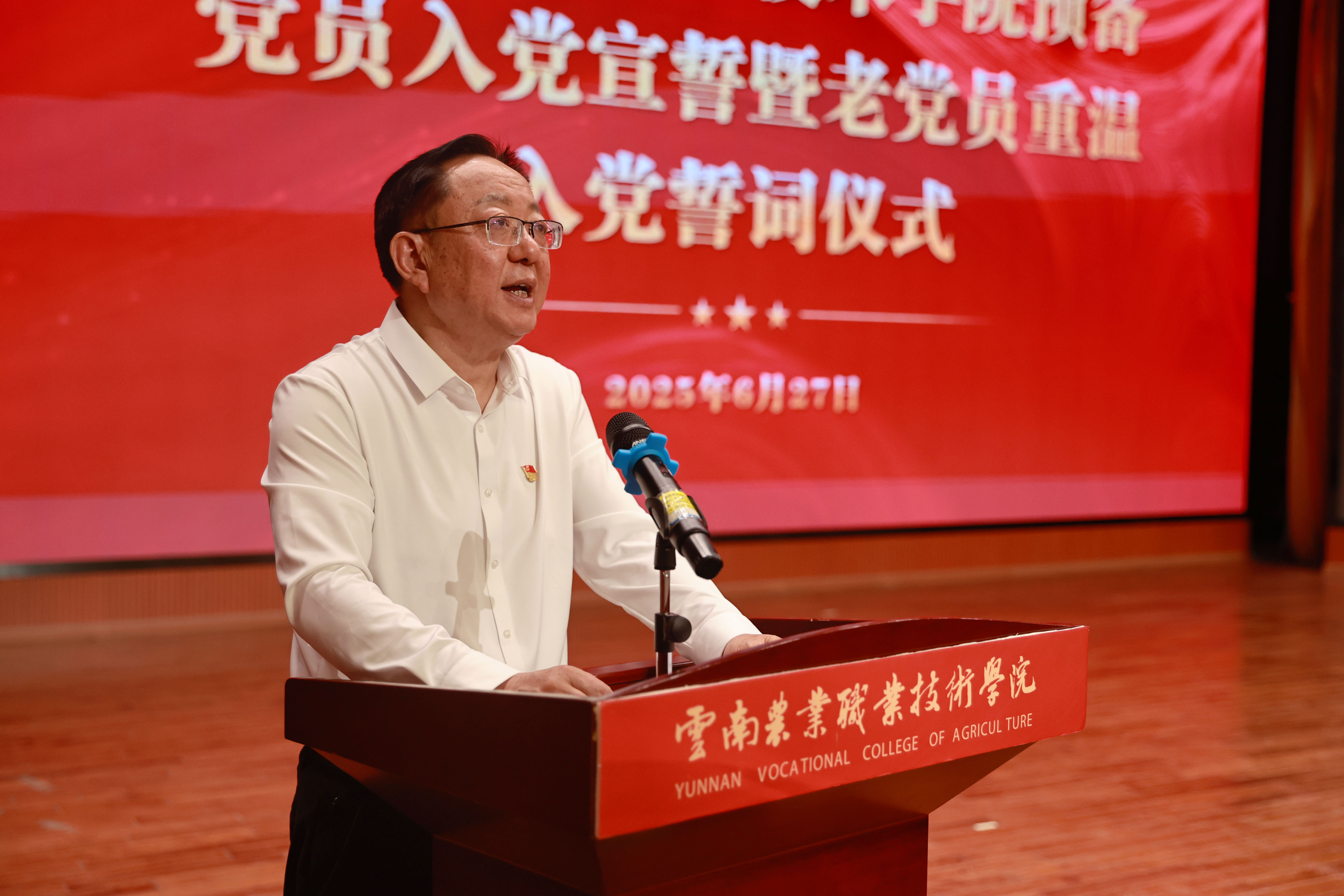 宣誓完毕后,文俊书记、陈太安校长、杨波副书记、组织部部长夏体韬共同为预备党员代表佩戴党徽。一枚枚闪亮的党徽,不仅是身份的象征,更承载着责任与使命。希望新党员们从佩戴党徽的那一刻起,牢记党员身份,践行党员职责,自觉接受监督,充分发挥先锋模范作用。