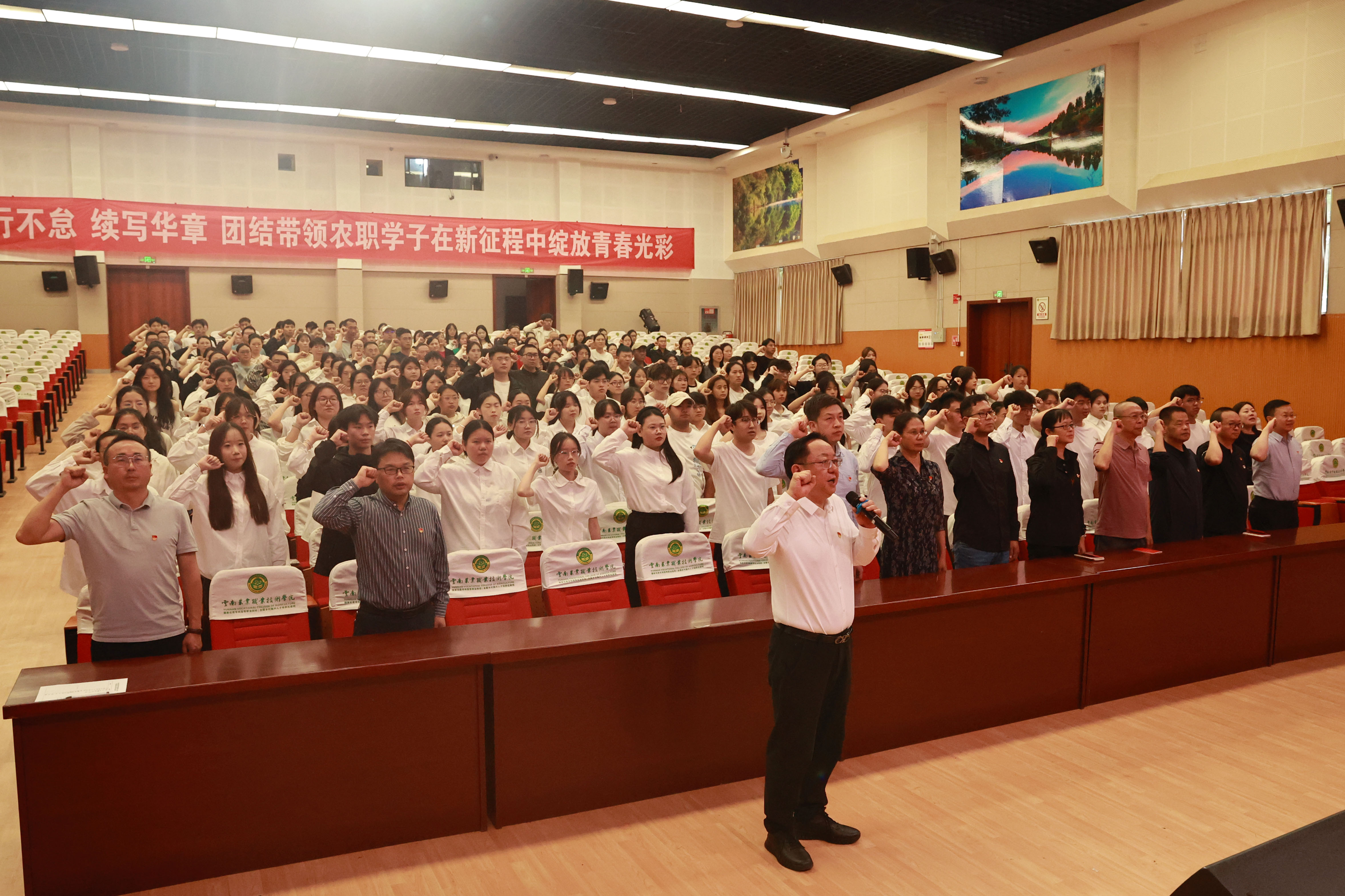 仪式在庄严的国歌声中拉开帷幕。随后,文俊书记带领全体党员高举右拳,面向党旗庄严宣誓。铿锵有力的誓言在会场回荡,表达了党员们对党的无限忠诚和为共产主义事业奋斗终身的坚定决心。