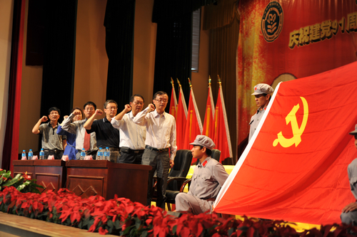在新党员宣誓仪式上,党委办公室主任凌军带领544名预备党员面对党旗庄严宣誓;老党员与新党员一起重温入党誓词。