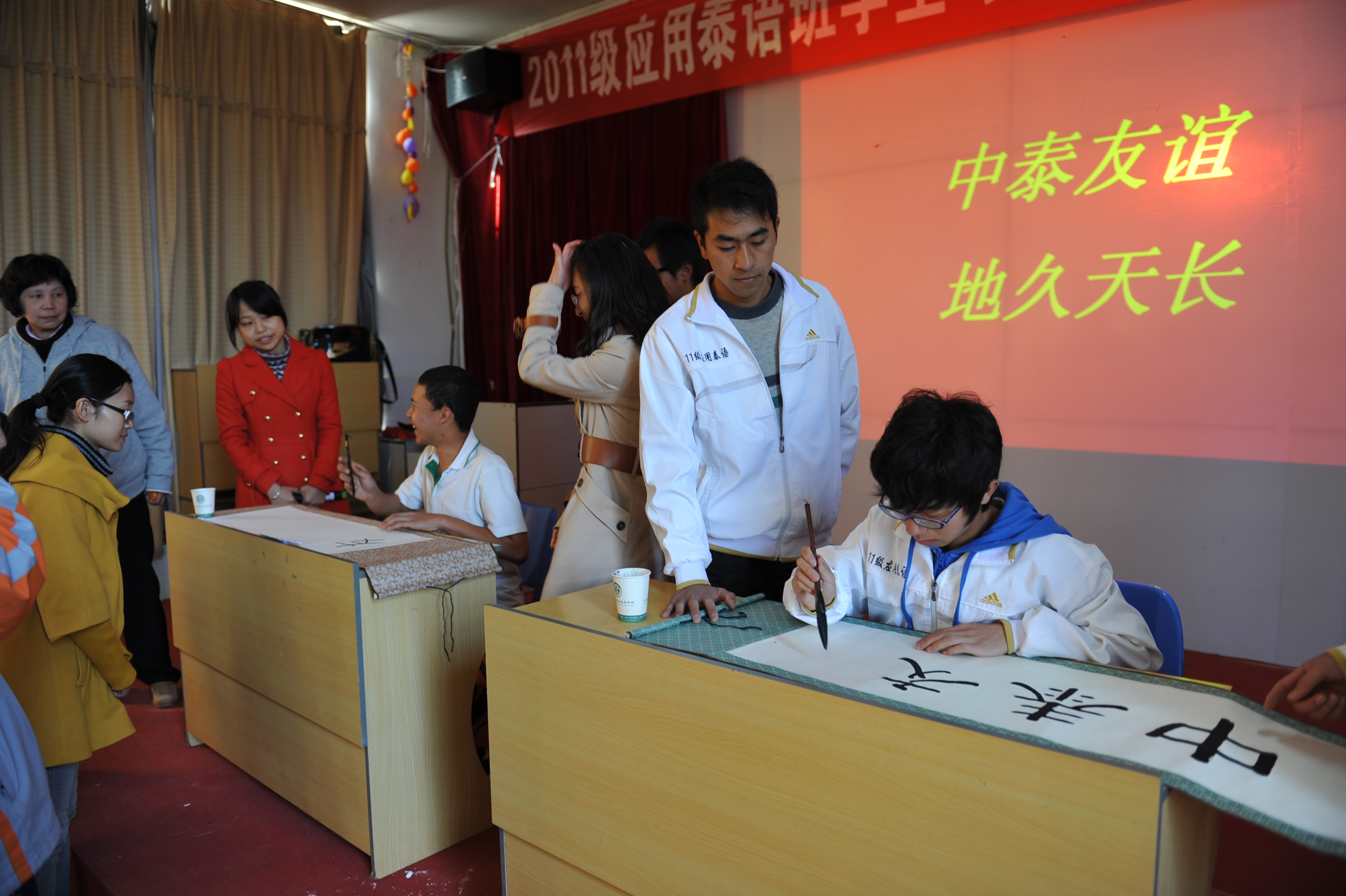 通知中心 2011年11月23日上午,基础部2011级应用泰语班学生与我院第六批泰国留学生交流联谊会在小哨校区多媒体教室三举行。基础部副主任李憬、对外合作交流处教师郑芳、泰语教研室教师汤林芸、2011级应用泰语班学生和泰国18名留学师生出席了此次联谊会。