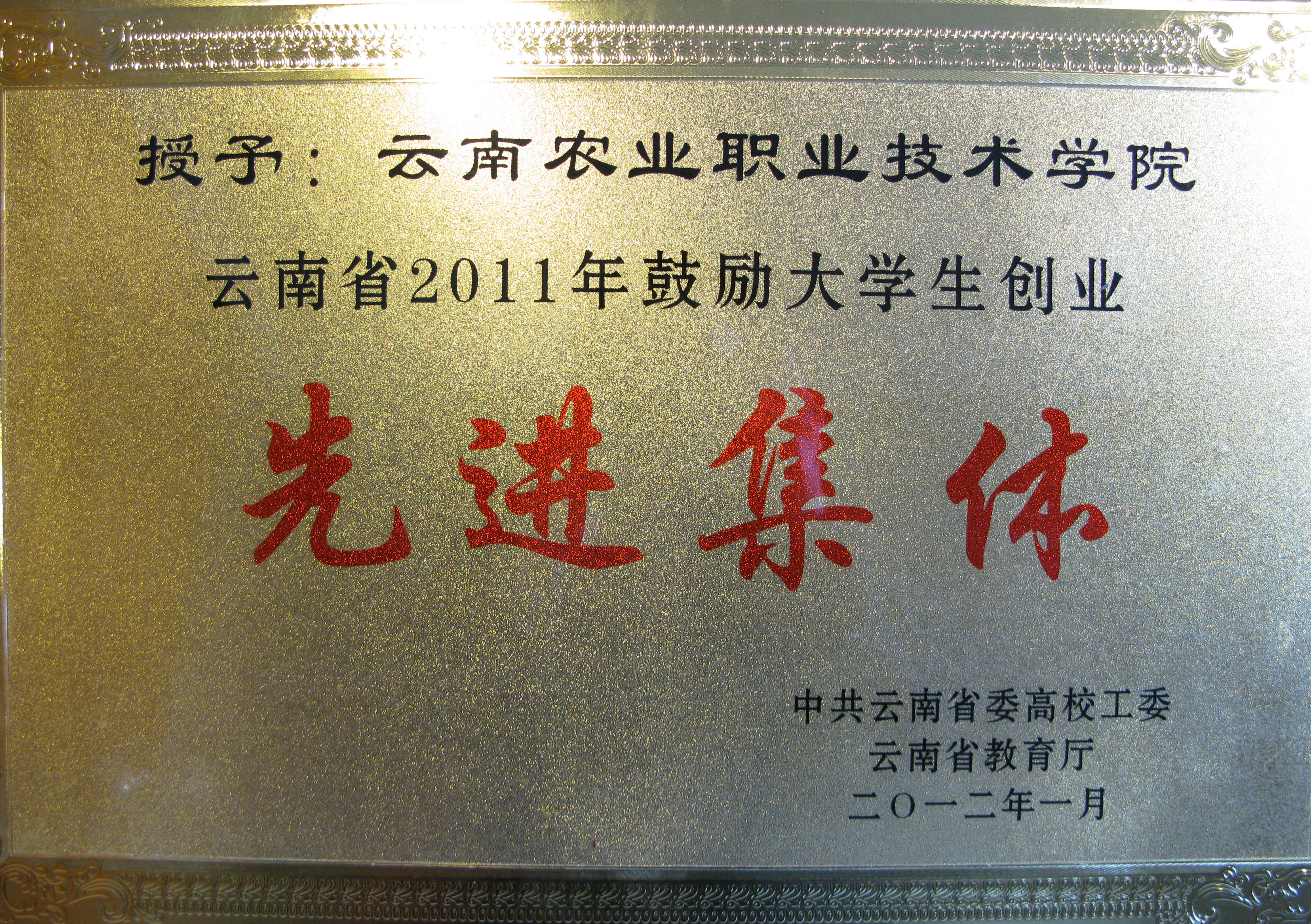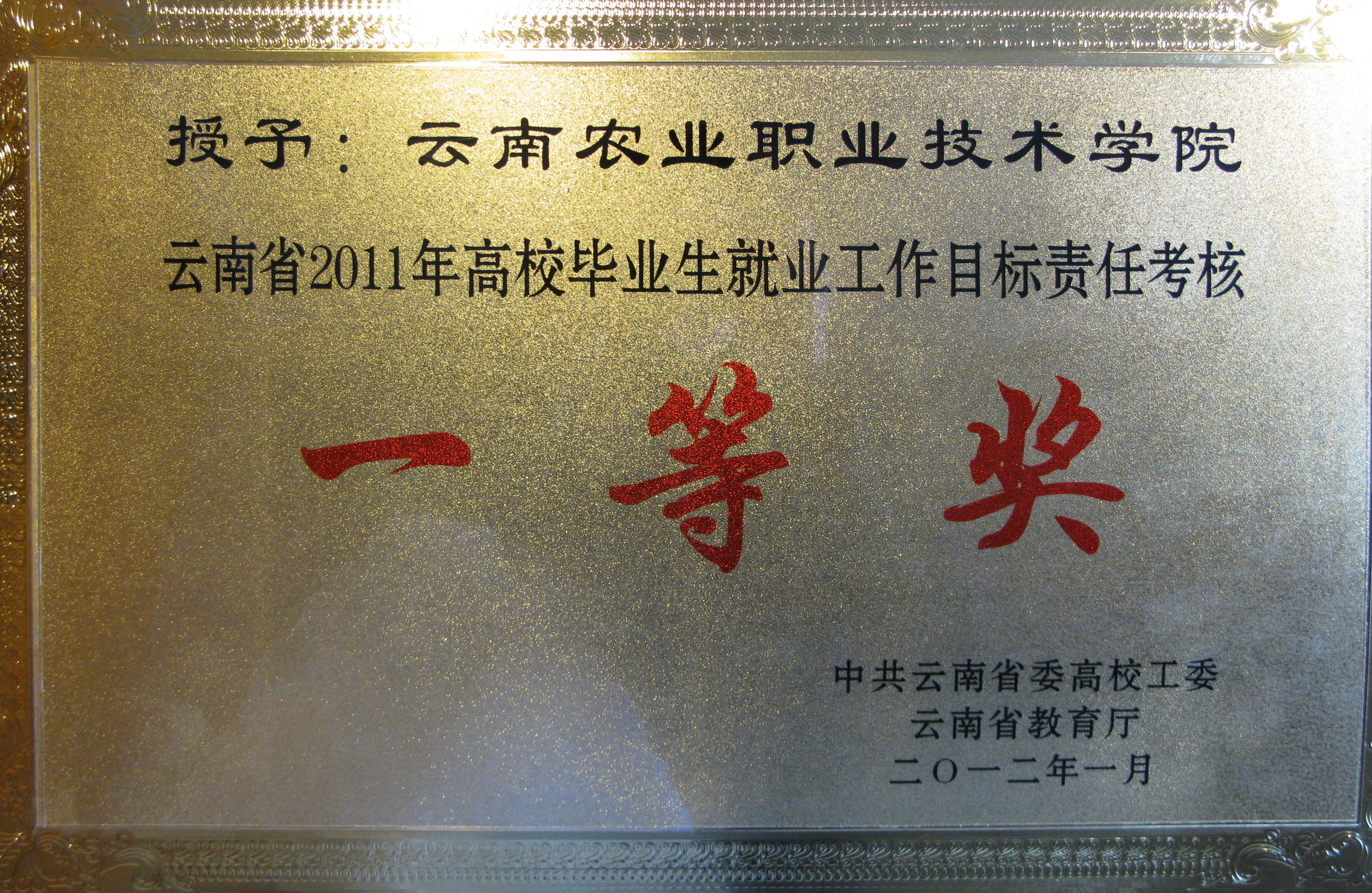 据中共云南省委高校工委、云南省教育厅《中共云南省委高校工委云南省教育厅关于表彰2011年高校毕业生就业工作先进单位的决定》(云高工办【2012】5号)获悉,为激励先进,发扬成绩,进一步调动全省各州市教育局和高校做好毕业生就业工作的积极性,经省委高校工委会、省教育厅党组会研究通过决定在对高校毕业生就业工作进行全面考评的基础上,对就业工作目标任务完成情况较好、毕业生入伍预征工作和鼓励大学生创业成绩突出的州市教育局和高校予以表彰, 32所高校荣获就业一等奖,21所高校荣获就业二等奖;13个教育单位荣获大学生创业先进集体奖。