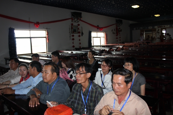 李永忠院长致欢迎词,他代表学院热烈欢迎棉吉大学校长一行来云南参观培训。他首先介绍了我院的办学历史、专业设置、校区建设、系部设置、学生就业等情况。李院长着重介绍了我院对外国际交流所取得的成绩,与日本、韩国、泰国、柬埔寨等国友好合作交流的具体情况。李院长强调学院要继续与柬方深化合作,一是学历培养合作,二是短期教师学生培训,三是农业科技服务,例如玉米、花卉、水果等作物种植合作,可以通过科技园这一平台作为突破点逐步扩大合作的范围。最后他预祝中-柬农业科技友谊示范园项目国内第二期培训项目取得圆满成功。