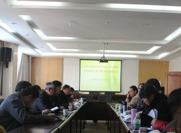 2014年12月24日,由科研管理处的组织,学校2014年省教育厅科研基金及学校项目验收会在茭菱校区三楼报告厅召开。学校党委书记崔金赋、校长助理田应华,纪检监察审计处处长杨芳、科研管理处副处长孔令书等领导出席了会议,学院聘请昆明学院科研处处长王定康教授、云南农业大学动物科学院苗永旺教授、云南省冻精站党委书记鲁增荣高级兽医师、云南大学公共管理学院袁旭明和匡自明教授、昆明市种子管理站李俊流高级农艺师等6名知名专家和学校党委书记崔金赋研究员、院长助理田应华教授、农学院院长王孟宇教授共同组成的评审团对学院的18个科研项目进行结题评审。田应华助理主持会议。